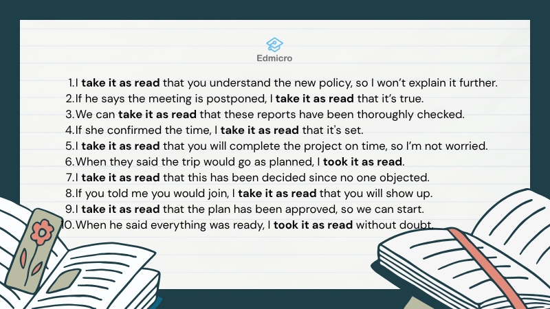 - You can take it as read that we will support your proposal. (Bạn có thể ngầm hiểu là chúng tôi sẽ ủng hộ đề xuất của bạn.)