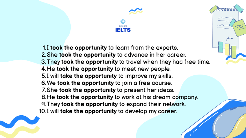 - She took the opportunity to learn a new language. (Cô ấy đã chớp lấy cơ hội để học một ngôn ngữ mới.)