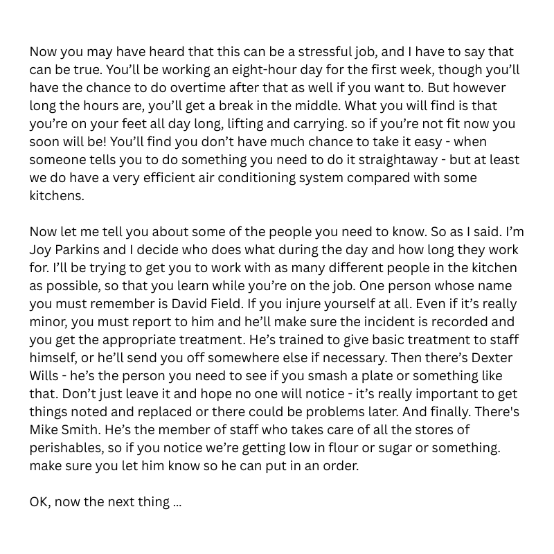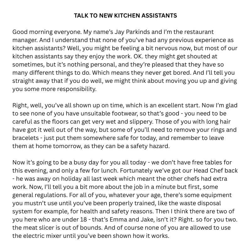 Dưới đây là bộ câu hỏi đầy đủ của bài IELTS Listening Talk to new kitchen assistants: