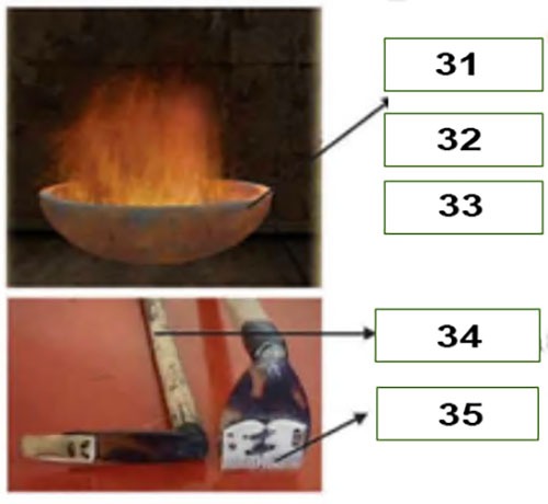 bowl made of 31 ………………….. burn the material inside to get 32 ………………….. , and stir in the 33 …………………..