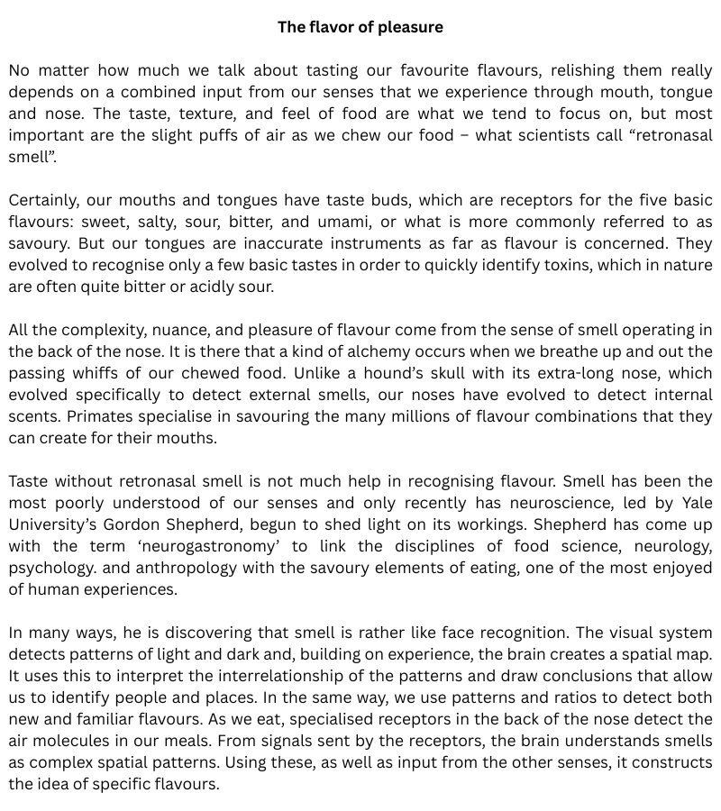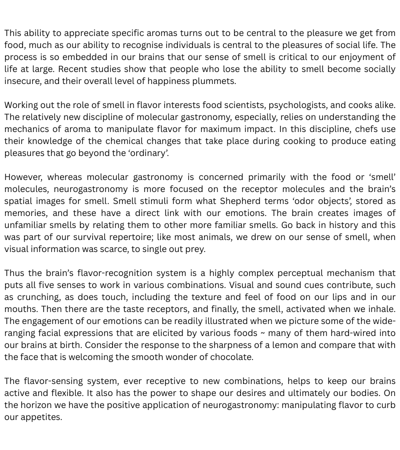 | Smell | Receptors recognize the 8 ………………… in food | The brain identifies certain 9 ………………… | Smell is key to our enjoyment of food |