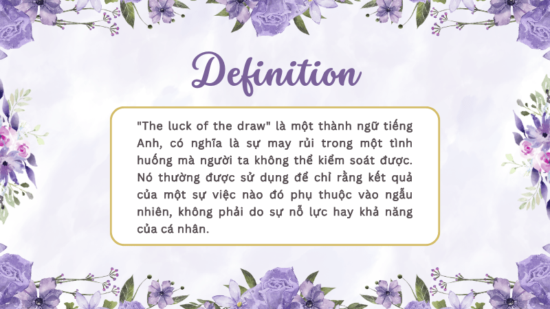 “The luck of the draw” là một thành ngữ tiếng Anh, có nghĩa là sự may rủi trong một tình huống mà người ta không thể kiểm soát được. Nó thường được sử dụng để chỉ rằng kết quả của một sự việc nào đó phụ thuộc vào ngẫu nhiên, không phải do sự nỗ lực hay khả năng của cá nhân.