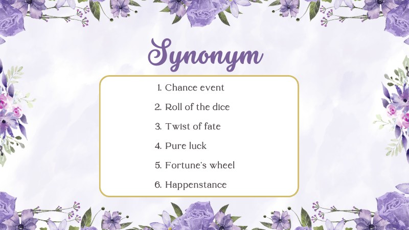 | Happenstance | Điều gì đó xảy ra ngẫu nhiên | They met by sheer happenstance at the airport. (Họ gặp nhau hoàn toàn tình cờ tại sân bay.) |