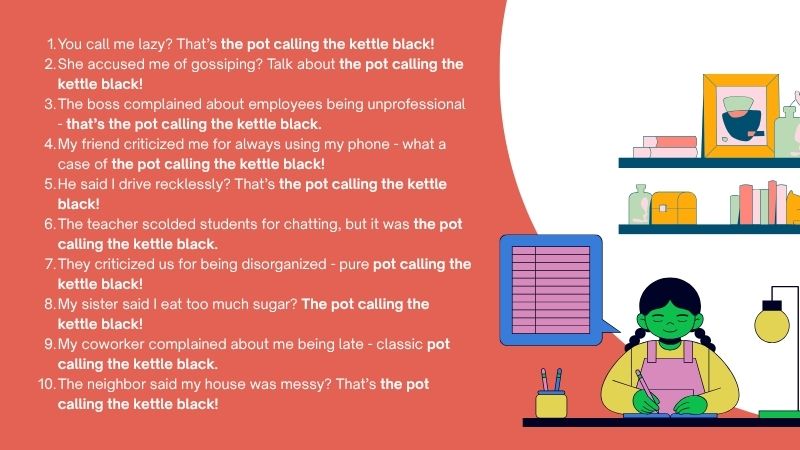 Dưới đây là 3 đoạn hội thoại dài hơn sử dụng idiom “The pot calling the kettle black” trong các tình huống đời thường: