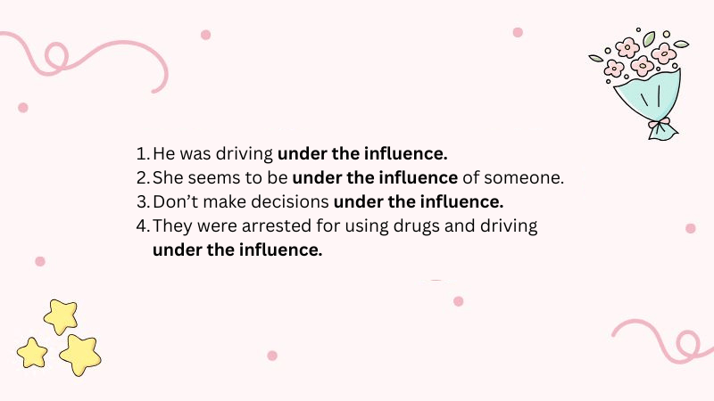 Under the influence thường dùng để chỉ tình trạng một người đang bị tác động bởi rượu, ma túy hoặc chất kích thích, ảnh hưởng đến khả năng suy nghĩ và hành động bình thường.