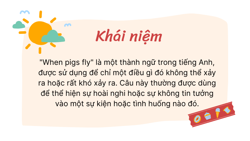 “When pigs fly” là một thành ngữ trong tiếng Anh, được sử dụng để chỉ một điều gì đó không thể xảy ra hoặc rất khó xảy ra. Câu này thường được dùng để thể hiện sự hoài nghi hoặc sự không tin tưởng vào một sự kiện hoặc tình huống nào đó.